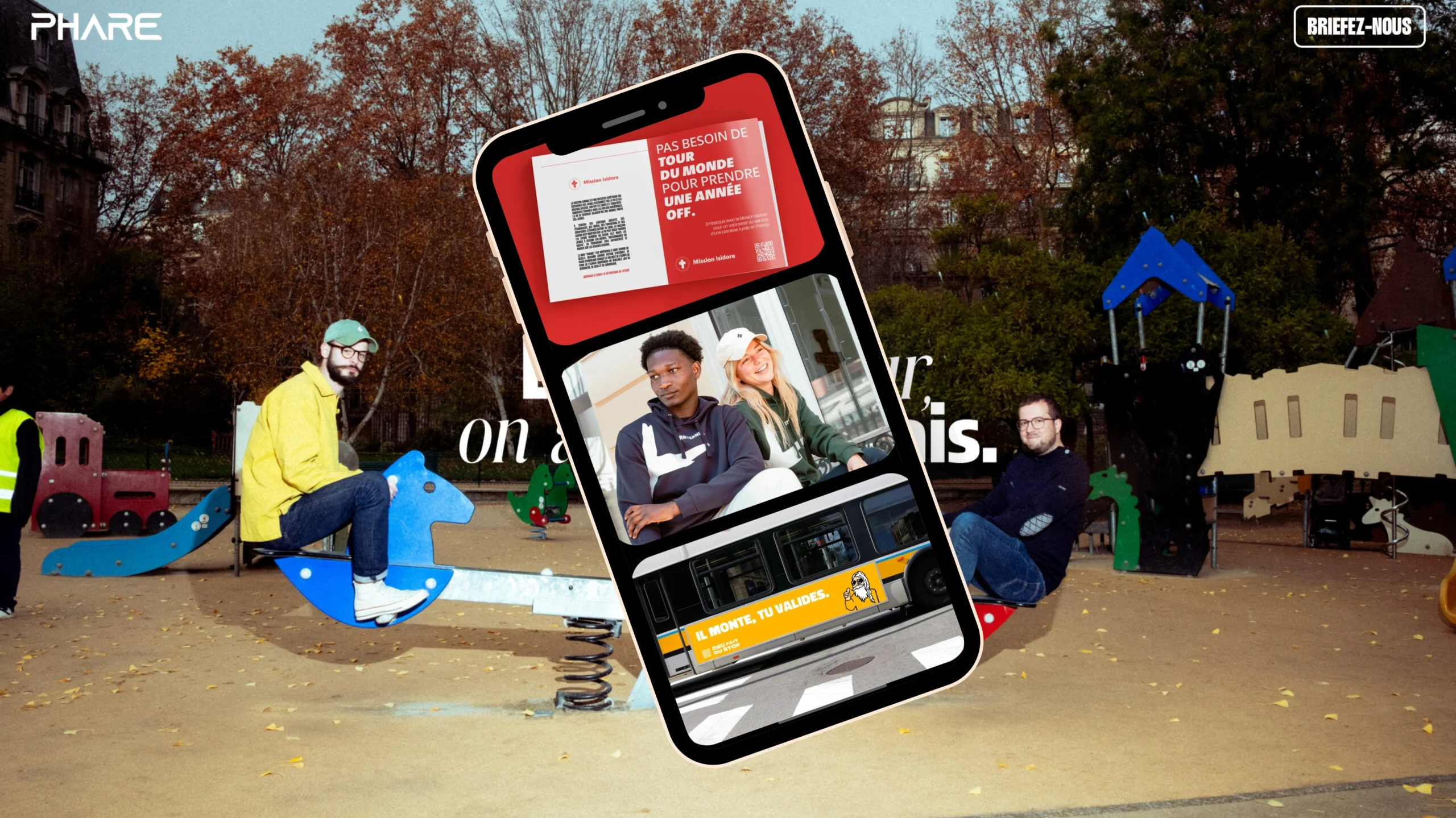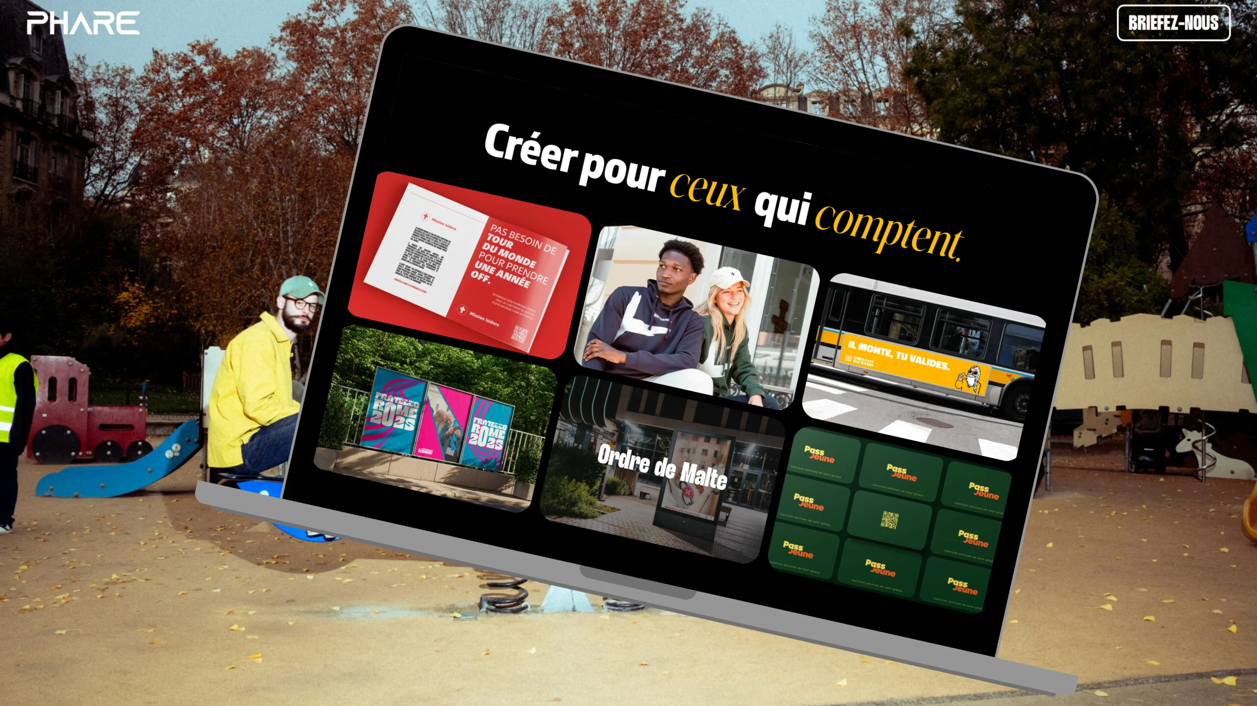 PHARE dà visibilità ai progetti impegnati e ad alto impatto, offrendo loro dispositivi di comunicazione coerenti, creativi ed efficaci. Le campagne ideate dall'agenzia contribuiscono a far emergere cause essenziali nello spazio pubblico e a rafforzare la loro capacità di toccare, mobilitare e fare agire. Questo partenariato illustra una visione comune della comunicazione come leva di significato e impegno.